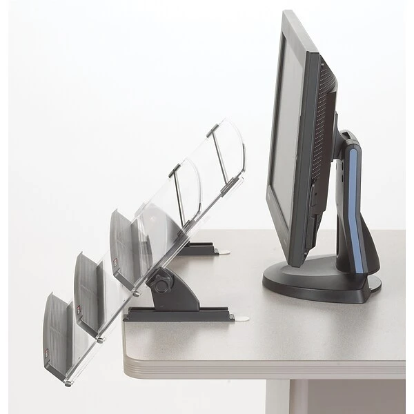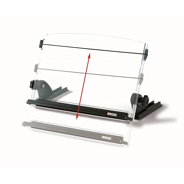 3M™ In-line document holder for desktops and laptops. Keeps documents between monitor and keyboard to help reduce head, neck and eye movement. Wide, transparent backplate supports wide & heavy documents. Skid-free base. Angle and height adjustable. Keeps documents between monitor and keyboard to help reduce head, neck and eye movement. 14 in wide by 11 in high, transparent back plate supports wide and heavy documents. Skid free base. Angle and height adjustable. Can stand alone on desktop or hang over edge. Elastic line guide enables easy data entry and helps keep documents in place.
