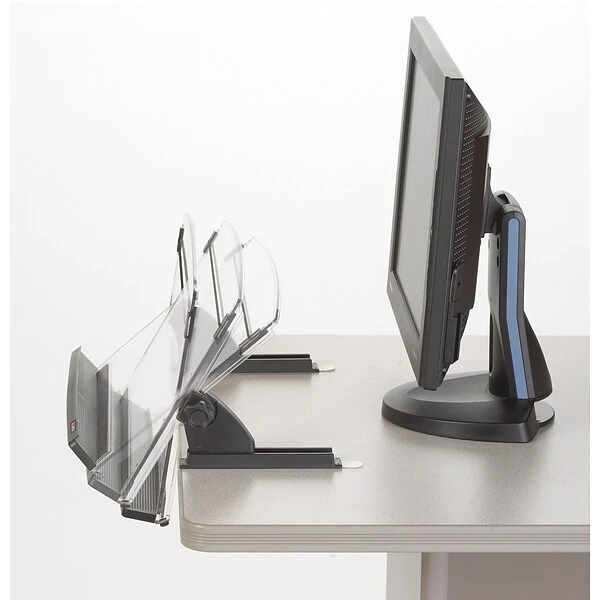- Height and angle adjustable document holder places documents in-line with your monitor and keyboard reducing movement of eyes, neck and shoulders minimizing strain and increasing comfort.
