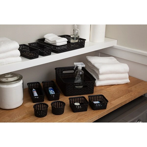 Sturdy bins with an attractive, functional design are perfect for organizing your space. Bins come in multiple sizes to accommodate items of various items. The weave design offers a fashionable accent.