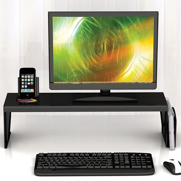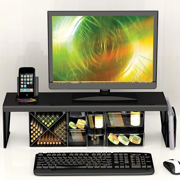 This environmentally responsible, recycled plastic shelf can keep supplies off your desktop or maximize your desktop space by using it as a monitor stand