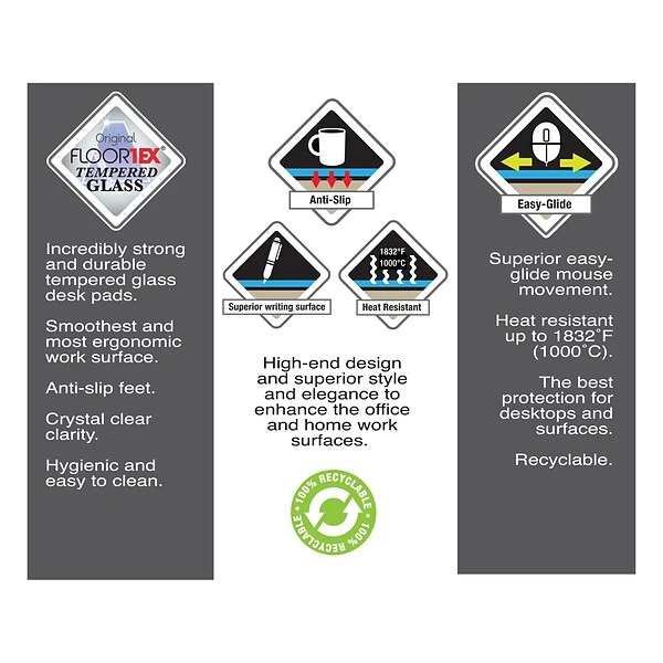The superior protection for your desktop or work surface, Desktex’s Glaciermat is a high-clarity desk pad made of reinforced glass. Glaciermat won’t break, crack, scratch, or discolor under normal use. A glass desk pad helps keep your desk looking clean, tidy, and well-organized, and the Glaciermat also provides a high-end, smart appearance.