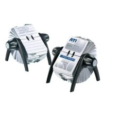 Sleek-looking rotary business card file with up-to-date features like large ergonomic knobs with rubber inserts for gripping and turning ease. Rotation mechanism holds cards in place for viewing. Rubber pads on legs prevent slipping and surface scratching. Durable plastic construction. Stores 400 business cards in 200 pre-loaded, double-sided clear slotted sleeves (included). Sleeves are 2 7/8″ x 4 1/8″ and hold two cards each. 25 pre-loaded alphabetical (A-Z) dividers included. Manufacturer’s one-year limited warranty.