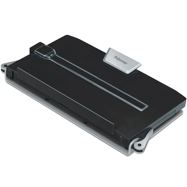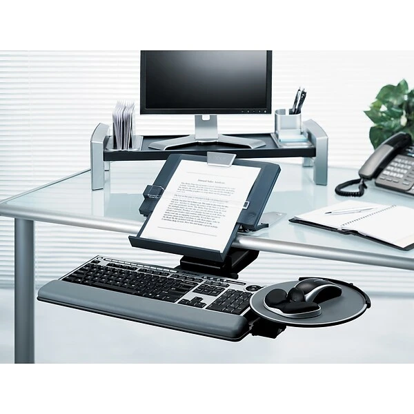The Fellowes® Professional Series In-Line Document Holder places documents between monitor and keyboard for optimal ergonomic viewing range. Offers six separate angle adjustments from 75° to 25° incline. Promotes neutral posture and helps reduce awkward neck and eye movements. The top and bottom sections adjust to accommodate oversized documents. Supports books, catalogs, and landscape sheets. Moveable, magnetic line guide securely holds up to 250 pages of letter/legal size documents. Stable weighted base; unit folds flat for easy storage.