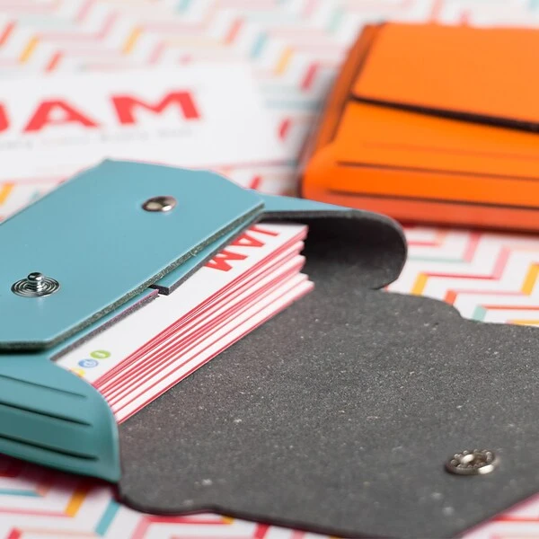 JAM Paper and Envelope’s angular flap Italian leather snap business card cases are designed and made in Italy. These cases are made with 80% natural regenerated leather and 20% natural rubber, which gives them a rubber feel and texture. The cases hold a pproximately 20 standard size business cards, measures 3.5″ L x 2.25″ W x 0.25″ D, and has a button snap on the flap so you can snap it closed and store your business cards safely inside. Great to use around the office, at conferences, corporate events, career fairs, and on the go, these card cases help you to present your business cards in a professional and stylish way. This leather case comes in black, and is sold in packs of 100.