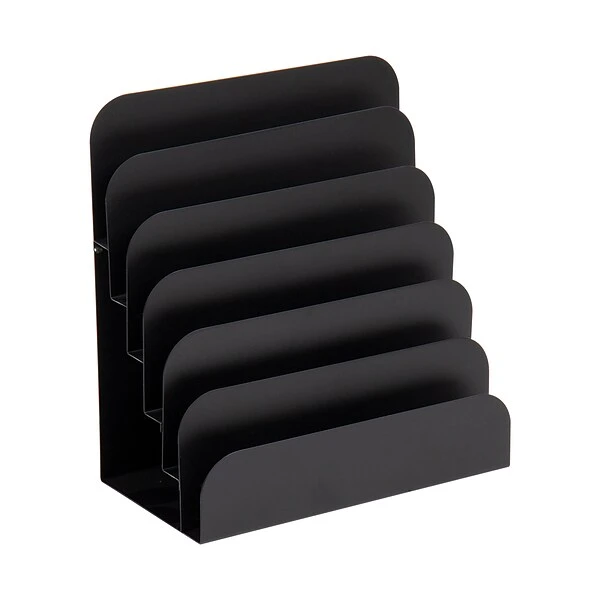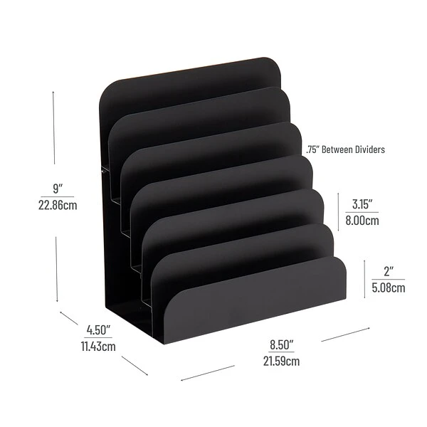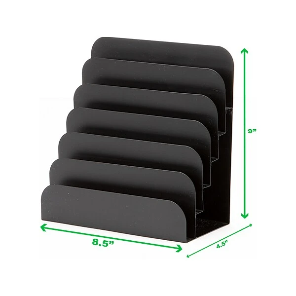 Versatility Meets FunctionalityGet the most out of your correspondence sorting needs with this 6-tier vertical file organizer that offers you a wide range of versatile uses in every work setting. Keep recipes, mail, and more in this multi-compartment sorter with wide openings and deep dividers. Eliminate clutter on desks, counters, and tabletops with this functional home and office accessory that keeps all your items neat and organized. You can use this sorter as a desktop storage unit to separate incoming and outgoing correspondence and add different calendar date ranges to the dividers to make sorting and paying bills timely and more efficient. This vertical file organizer is helpful in the correspondence sorting and distributing process. You can organize mail, documents, and other types of correspondence by the recipient to make distribution faster and more efficient. The black file organizer is made from metal which makes this a durable choice, unlike plastic file sorters that are prone to cracking when dropped or from repeated use. The wide pockets allow you to dust between sections with ease, and you can clean any spills with a damp cloth.The vertical organizer is long and wide enough to hold many items upright and securely. This correspondence organizer is a great gift for co-workers, students, and anyone who can benefit from more space and organization in their daily routines.