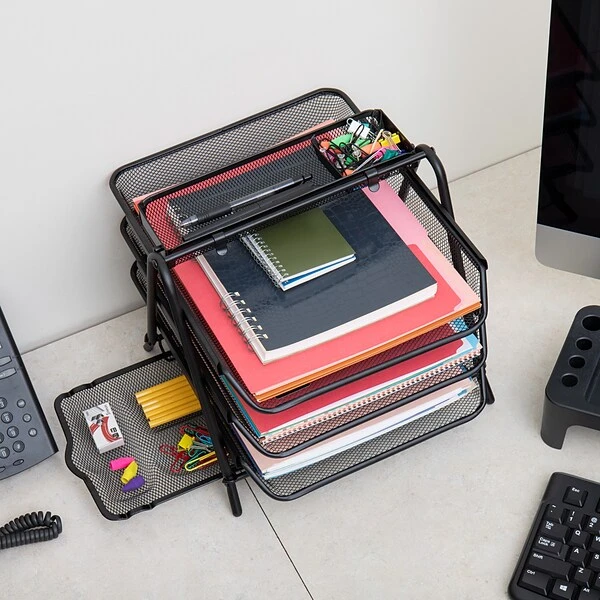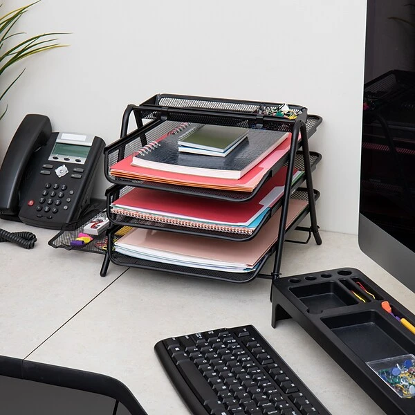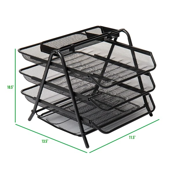 Free up valuable desk space with this three-tier black metal mesh file tray. The sturdy metal construction offers durability and lets this tray handle heavy loads, while the mesh design lets you view contents easily. This Mind Reader Census metal mesh file tray has three tiers to provide ample organization options, and the black coloring offers a professional look.