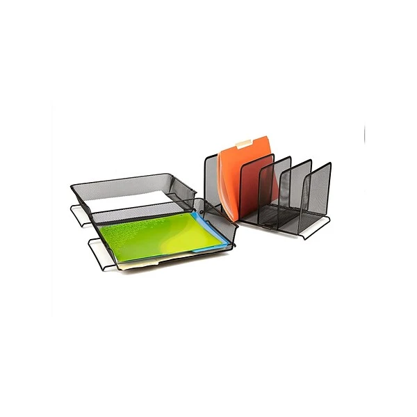 - Save space around your desk with front loading letter trays