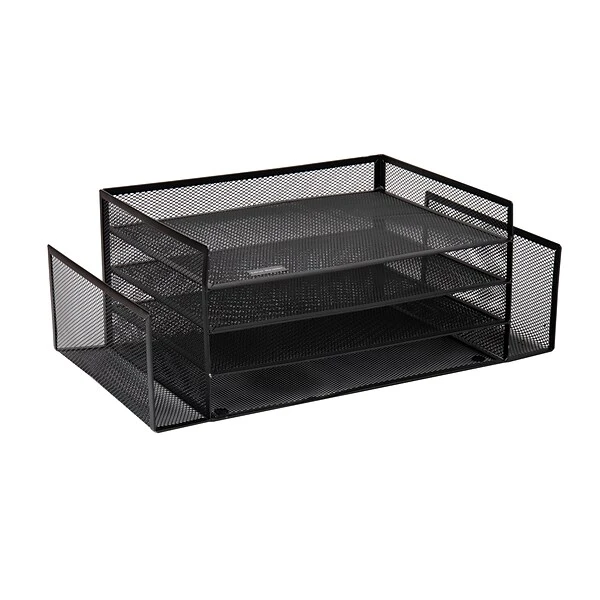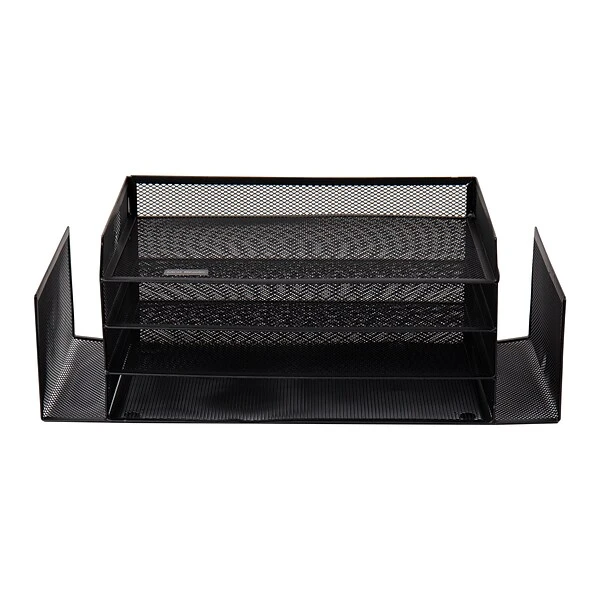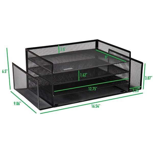 Organization Made Beautifully SimpleWhen up against this large capacity desktop organizer, clutter has finally met its match. This desktop organizer has six separate compartments to hold a variety of items. There are four tiers of deep shelves for documents, files, and other large items, and two vertical side compartments for items that are best stored upright. Organizing your space is made more efficient with the aid of this desktop organizer. Multiple levels of vertical shelves give you the opportunity to divide and conquer cluttered areas with ease. Add to that the open-ended vertical side compartments, and you have a space for organizing papers and files of practically any size for quick and easy retrieval. The metal mesh construction is both decorative and lightweight. Designed to be sturdy and stable, this file and document holder is made to withstand heavy stacks of files and other documents without compromising the integrity of this desktop organizer. Life gets hectic and spills can happen. There is no need to worry, cleaning up this metal organizer is as easy as wiping it down with a damp cloth and a light rinse with warm water.The roomy compartments and multiple tiers of this organizer are beneficial in various home or workplace settings. The desktop organizer takes up minimal space which also makes this a great gift idea for people with small spaces, busy parents, as well as anyone who can benefit from having a large capacity desktop organizer to help combat clutter and stay organized.