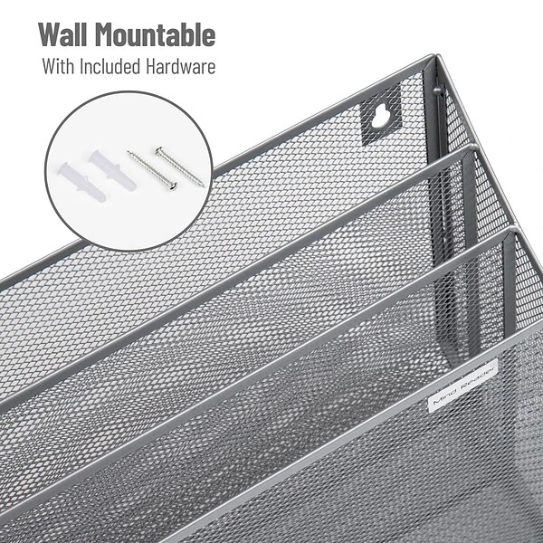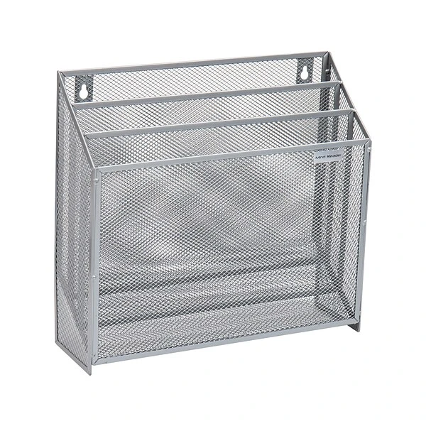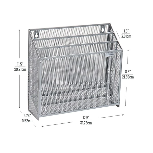 Organization at Your FingertipsThis 3-tier vertical file storage basket is a great addition to your office or kitchen or setup. It stands upright on your desk or countertop or it can be wall mounted with the included hardware. Its base measures 3.75 inches deep and 12.5 inches wide and it stands 11.5 inches tall. It’s a great storage and organization option for your files and documents on your desk or recipes and bills, magazines and periodicals in your kitchen. It’s perfect for students of any age or young professionals that like to keep their space tidy and neat.The tiers are angled which lets you see your documents at a glance — plus the metal mesh construction lets you see through it as well. Although it is tall, it is still unobtrusive for most desk and countertop layouts. It is functional right out of the box — no assembly is required.If the metal mesh needs to be cleaned, a wet cloth and mild soap can remove any dust or debris. Buy this vertical file basket for yourself, a favorite teacher, co-worker or for your soon-to-be college student.