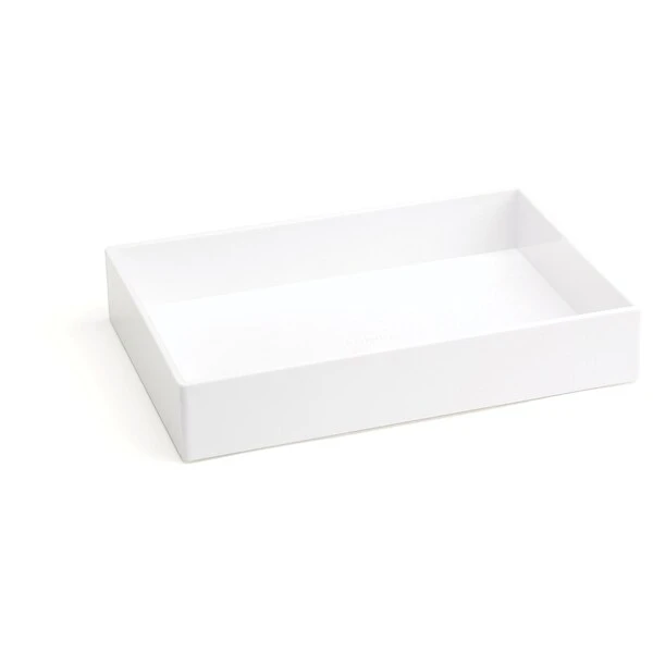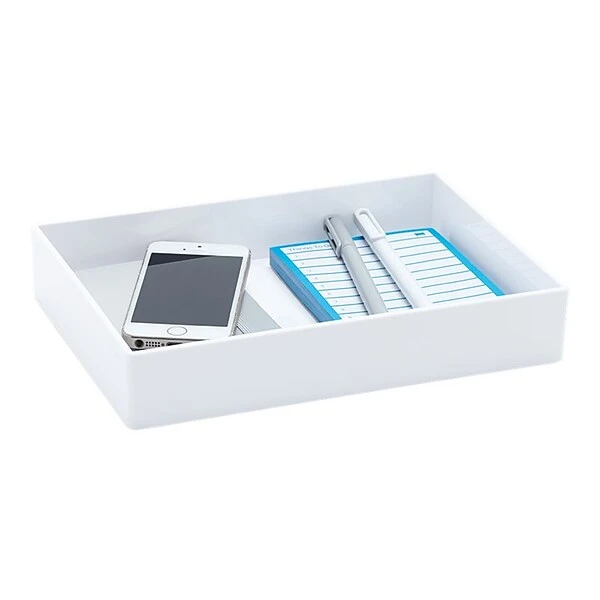 Manage desktop clutter and access office supplies easily with this medium accessory tray. Boasting a white lacquer-like finish, this tray adds a bright pop to any workspace, while the smooth, durable surface makes cleaning simple. This Poppin white medium accessory tray can be conveniently paired with other Poppin products, offering enhanced organization and a sleek aesthetic.