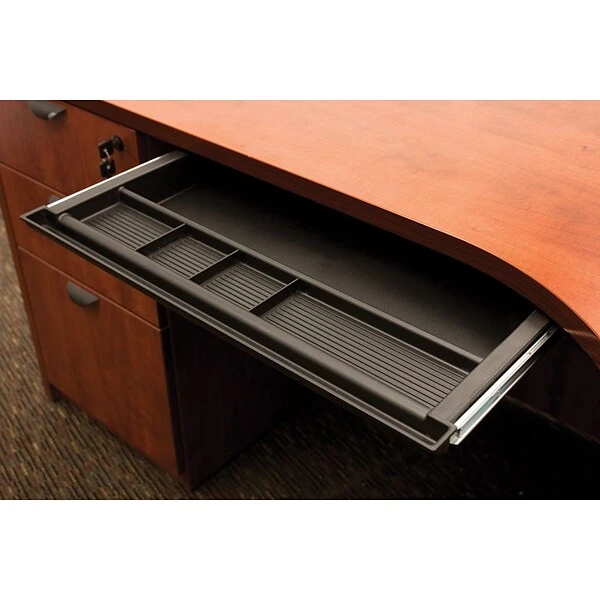 Add a little extra organization with Regency’s Center Drawer! Its five various-sized compartments help keep commonly used supplies out of sight but still within reach. It mounts to the underside of any wood surface with included hardware. The tray is constructed of a black blow mold plastic that is durable and can withstand every day use. At only 2″ thick, the Center Drawer slides in and out with great ease without compromising knee space under the desk. The Center Drawer is backed by a five-year limited manufacturer’s warranty.