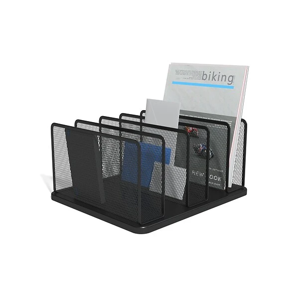 Improve the appearance of your workspace with this black mesh vertical file organizer. Tightly woven mesh provides durability, and a black finish complements flat square-rounded corners for a stylish look. With five slots, this sorter lets you keep files organized and easily accessible. This TRU RED™ five-slot black mesh vertical file organizer includes feet at each corner to prevent scratching up your work surface.