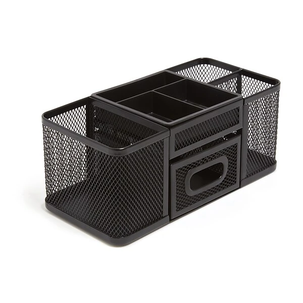 Maintain a clutter-free work surface with this accessory holder. The included drawer lets you keep a variety of small office items out of sight, while several storage areas allow for a personalized setup. This TRU RED™ matte black mesh accessory holder has updated feet to prevent scratches and slipping when placed on your desk, while the flat square-rounded edges offer a sleek look.