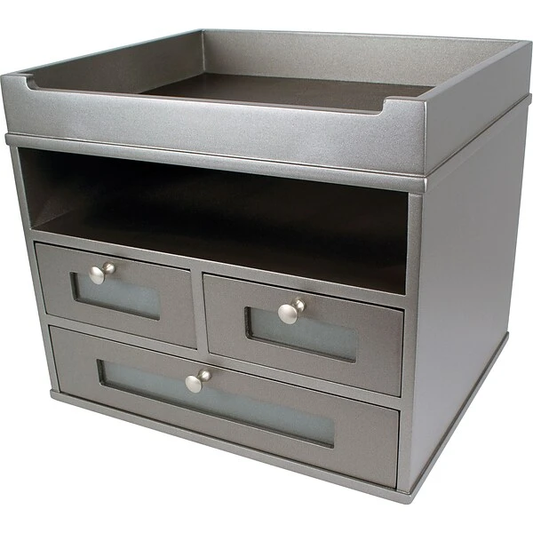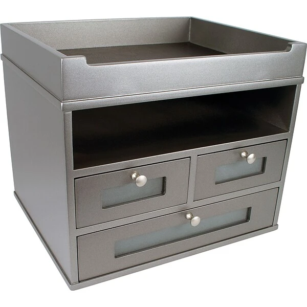 - The Victor Silver Tidy Tower is a unique organizer with a letter tray, drawers and an open shelf